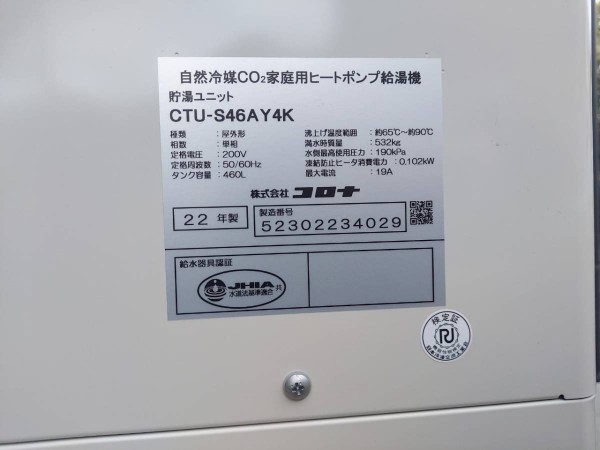 大竹市安条 コロナ自然冷媒CO2家庭用ヒートポンプ給湯機 貯湯ユニットCTU-S46AY4K エコキュート交換工事