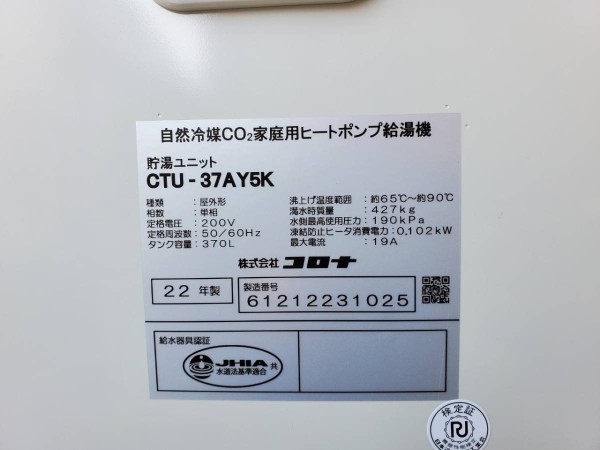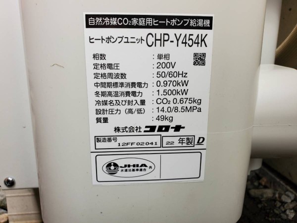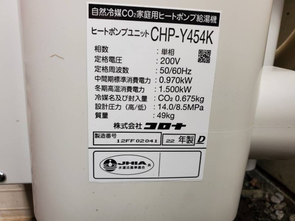 江田島市大柿町小古江 コロナ自然冷媒CO2家庭用ヒートポンプ給湯機 貯湯ユニットCTU-37AY5K、ヒートポンプユニットCHP-Y454K エコキュート交換工事