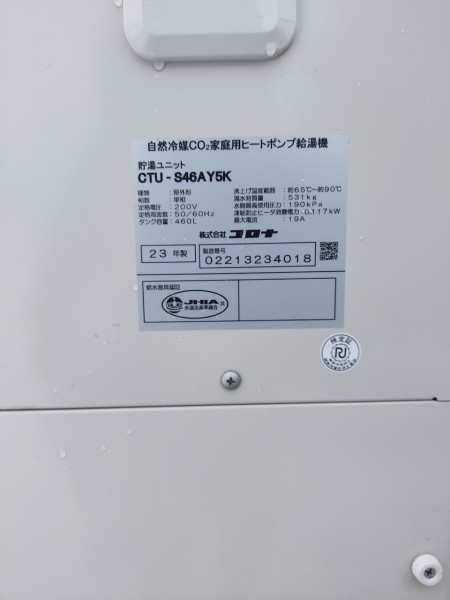 竹原市福田町 コロナ自然冷媒CO2家庭用ヒートポンプ給湯機貯湯ユニットCTU-S46AY5K エコキュート交換工事