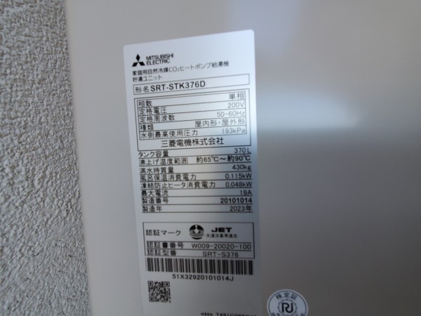 東広島市西条朝日町 三菱電機エコキュート→三菱電機自然冷媒CO2家庭用ヒートポンプ給湯機貯湯ユニットSRT-STK376D エコキュート交換工事