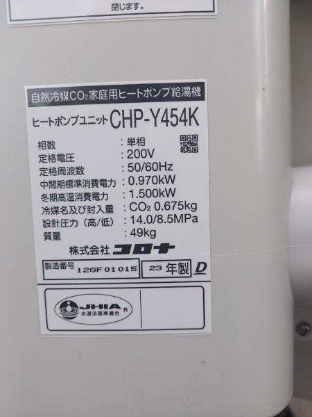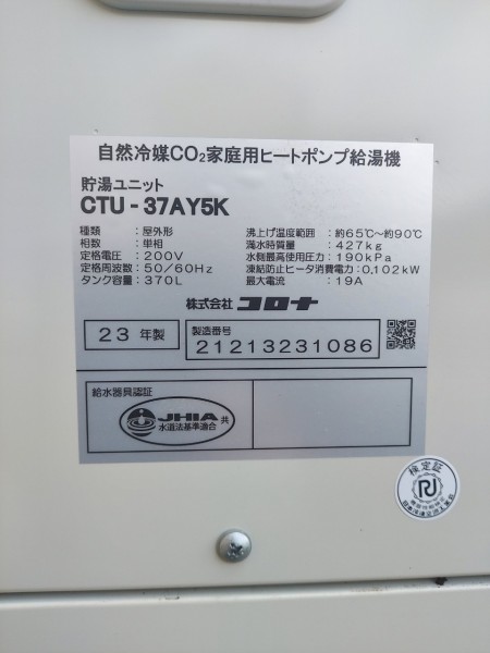 大竹市安条 コロナ自然冷媒CO2家庭用ヒートポンプ給湯機ヒートポンプユニットCHP-Y454K、貯湯ユニットCTU-37AY5K エコキュート交換工事