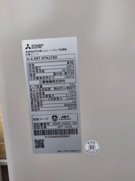 尾道市潮見町 三菱電機自然冷媒CO2家庭用ヒートポンプ給湯機貯湯ユニットSRT-STK376D、ヒートポンプユニット エコキュート交換工事