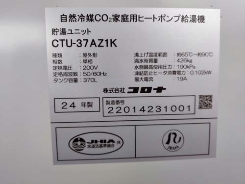 呉市朝日町 コロナ自然冷媒CO2家庭用ヒートポンプ給湯機貯湯ユニットCTU-37AZ1K、ヒートポンプユニットCHP-DZ451K エコキュート交換工事
