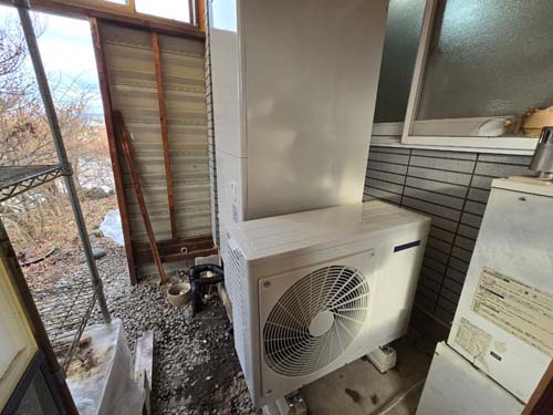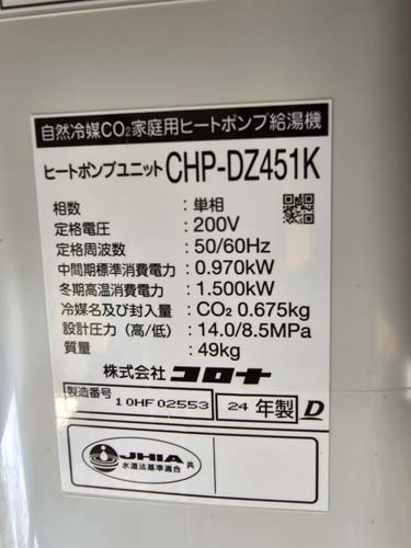 尾道市因島重井町伊浜 コロナ自然冷媒CO2家庭用ヒートポンプ給湯機 ヒートポンプユニットCHP-DZ451K エコキュート交換工事