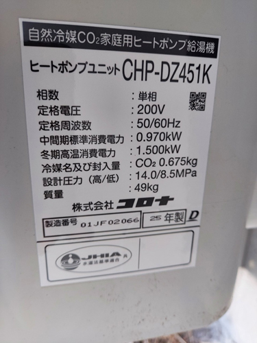 江田島市沖美町三吉 コロナ自然冷媒CO2家庭用ヒートポンプ給湯機 ヒートポンプユニットCHP-DZ451K エコキュート交換工事|広島県のエコキュート専門交換工事店|広島エコキュート交換ショップ補助金対応可能